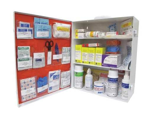 Includes:First Aid Guide, 4 oz Eyewash and Skin Rinse, (2) Sterile Eye Pad, 2 in Sterile Bandage Conforming Gauze, 3 in Sterile Bandage Conforming Gauze, 4 in Sterile Bandage Conforming Gauze, (2) 4 in x 4 in Burn Dressing, (4) 5 in x 9 in Trauma Pad, (2) Triangular Bandage, 1 in x 18 in Tourniquet, (2) 5 in x 6 in Cold Pack, Bandage Scissor, (4) Pair Nitrile Glove, C-Splint 24, CPR Face Shield, Tweezers, (8) Fingertip Bandage, (40) Knuckle Bandage, (50) 1 in x 3 in Fabric Bandage, (25) 3 in x 3 in Gauze Pad, (25) 2 in x 2 in Gauze Pad, (10) 0.9g Burn Cream, (5) 2 in x 4-1/2 in Patch Bandage, (5) 2 in x 3 in Non-Adherent Sterile Gauze, (10) Alcohol Prep Pad, (5) Antiseptic Towelette, (10) Butterfly Bandages, (10) Insect Sting Relief Wipes, (25) 0.9g Triple Antibiotic Ointment, (10) 0.9g Hand Sanitizer, (25) 1.8g Burn Treatment, (100) Cotton Swabs, Adhesive Tape Tri-Cut, (50) Pain and Ache Tablet Two Per Pouch, 3 oz Antiseptic Spray, 4 oz Cold Spray, 4 oz Hydrogen Peroxide Spray
